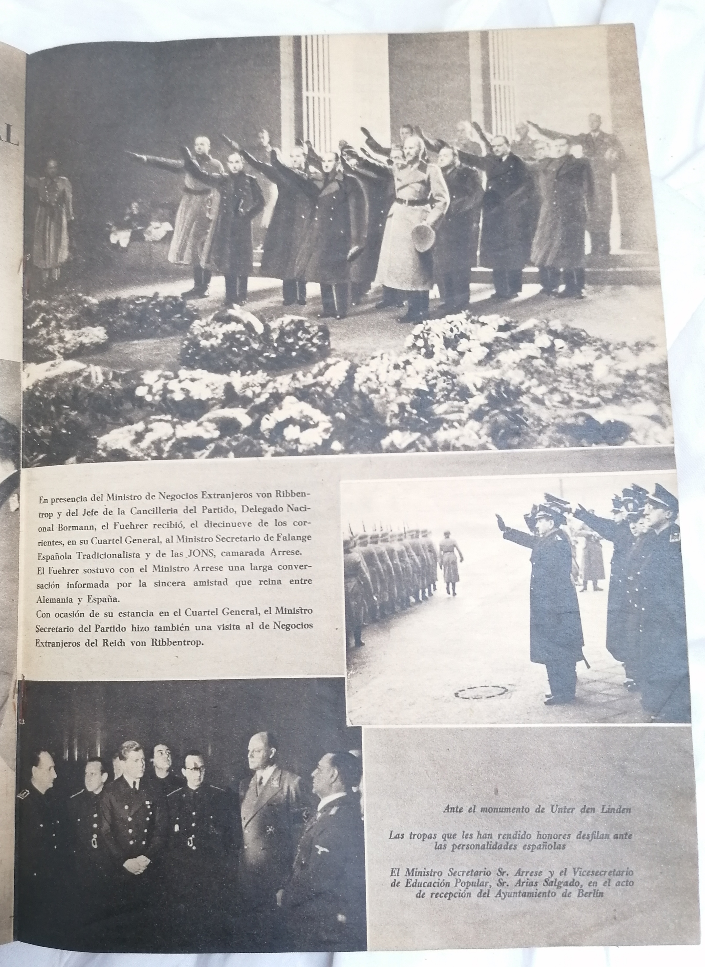 Escudo Nacional Español instituido por FET y de las JONS, a su cabeza el Jefe del Estado, Caudillo de la Cruzada Española europea en curso, SE. El Generalísimo Don Francisco Franco y Bahamonde, que es el de los Reyes Católicos, con elementos heredados del blasón del Rey Carlos I, y con incorporación del lema falangista : Una, Grande y Libre.
